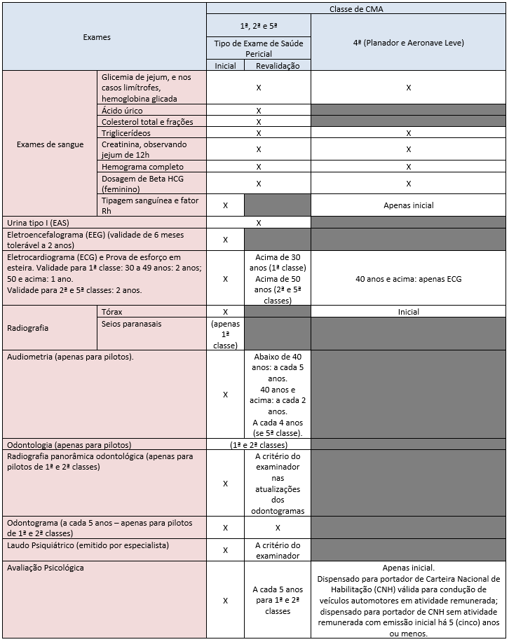 Os médicos, clínicas e Juntas de Saúde, são os responsáveis pela solicitação dos exames laboratoriais e de outros, caso necessário. A tabela abaixo ilustra os principais exames requeridos para informação dos candidatos: